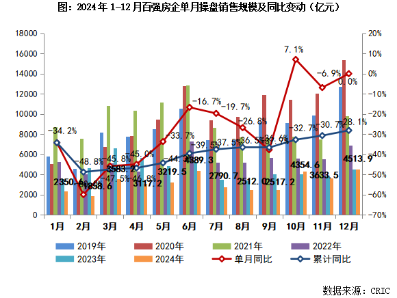 2024年12月,TOP100房企终了销售操盘金额4513.9亿元,环比增长24.2%,同比执平。累计功绩来看,1-12月百强房企终了销售操盘金额38840.2亿元,同比缩短28.1%,降幅较11月收窄近2.6个百分点。