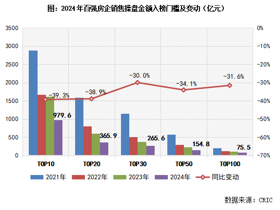 2024年,百强房企销售门槛值连接下移,且各梯队门槛均降到连年最低。其中,TOP10房企销售操盘金额门槛同比缩短39.3%至979.6亿元。TOP30和TOP50房企门槛也分别同比缩短30%和34.1%至265.6亿元和154.8亿元。TOP100房企的销售操盘金额门槛则缩短31.6%至75.5亿元。此外,2024年全口径千亿房企数目进一步减少至11家,回到2016年水平。